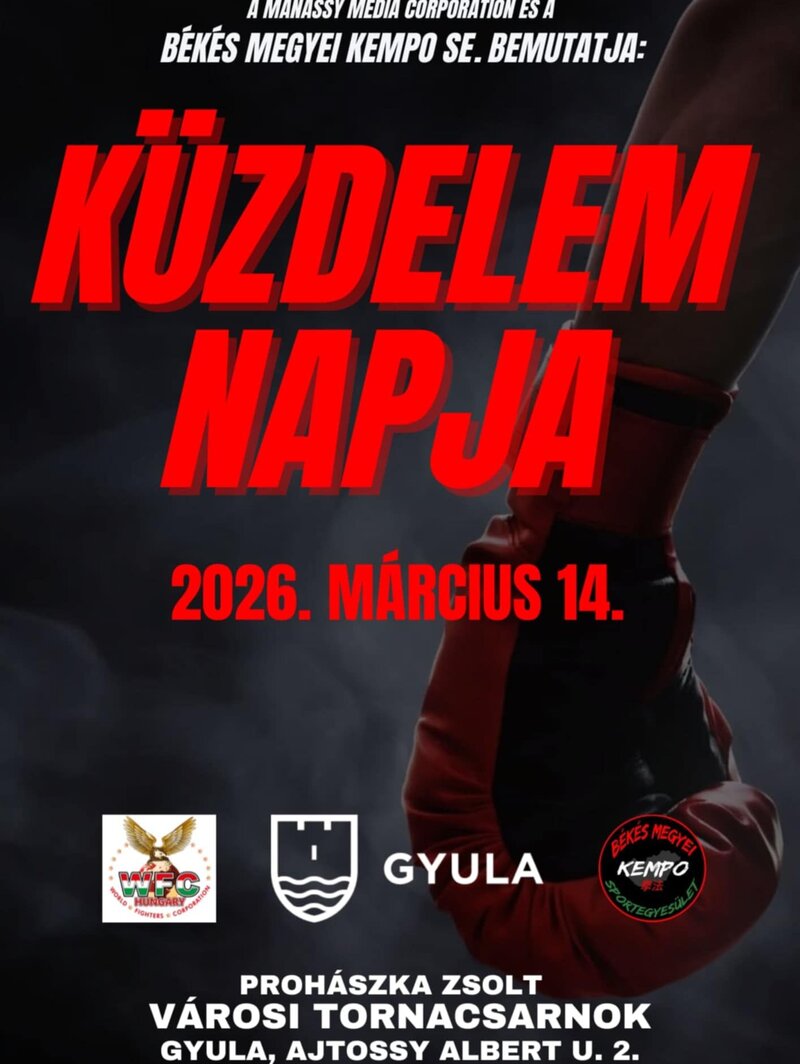 A Küzdelem Napja 2026 – Jubileumi Gála Gyulán2026 tavaszán ismét a küzdősportok fellegvárává válik Gyula! 2026. március 14-én kerül megrendezésre a már hagyománnyá vált, látványos és izgalmakkal teli Küzdelem Napja Gála, amely idén is a legkiválóbb hazai és nemzetközi harcosokat vonultatja fel.A rendezvénynek a modernizált Prohászka Zsolt Városi Tornacsarnok ad otthont, ahol a sportág szerelmesei professzionális körülmények között szurkolhatnak kedvenceiknek.Mire számíthat a közönség?